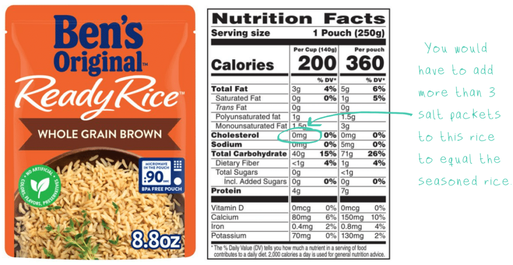 For example, this microwaveable pouch of seasoned rice contains 660mg of sodium per serving (15% of your daily sodium!!).